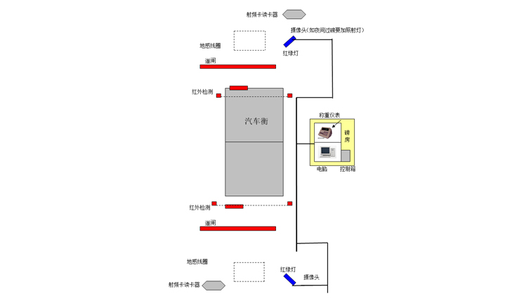 汽車衡無人值守系統可自動完成車輛的過磅。車輛從秤臺的入口上磅,從出口下磅,秤臺入門處用紅綠燈控制車輛通過,采用紅外定位。系統具有2套讀卡器裝置,安裝地磅入口處和出口出,當電子卡片(遠距射頻卡,讀卡距離0-9米)接近讀卡器時,讀卡器能夠檢測到車輛的到來,通過電腦控制自動完成稱重、打印磅單、拍照的稱重過程,系統數據采用SQLSERVER2000小中型數據庫。稱重電腦可以相互聯網稱重,在其中一臺稱的皮重的記錄可以到其它電腦上調出來再稱重。